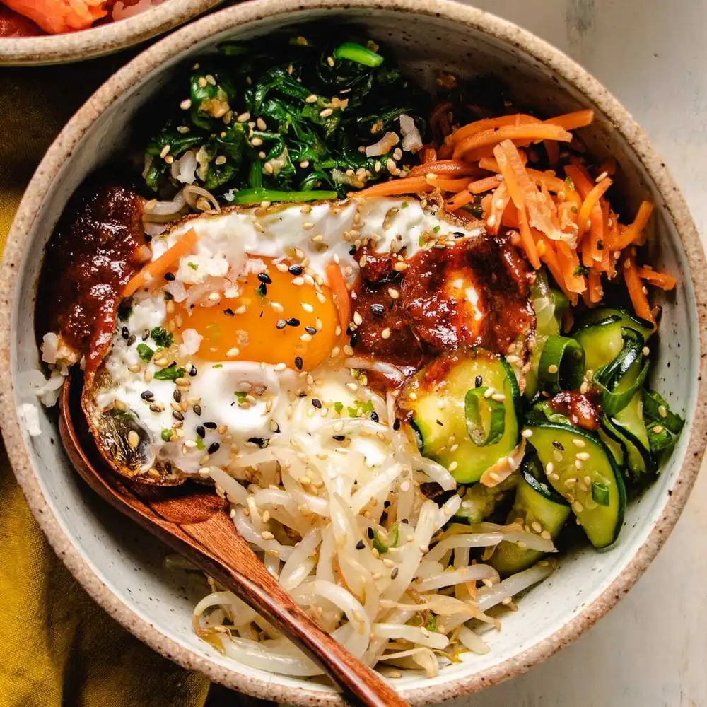- 2Top with beef bulgogi, sautéed carrots, seasoned spinach, grilled zucchini, and blanched bean sprouts.